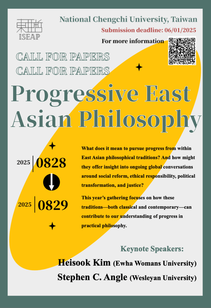 International Society of East Asian Philosophy | ISEAP(国際東アジア哲学学会) News ISEAP YouTube Channel has been launched! CHECK IT OUT HERE! NEW![Activities] News 2025.04.15 【ISEAP 5th Conference】 【Call For Papers】ISEAP 2025 Conference (August 28-29, 2025) will be held at the National Chengchi University, Taiwan. Please click here for more details. [Activities] News 2024.07.12 [ISEAP 4th Conference] 【Program and Abstracts】ISEAP 2024 Conference will be held on December 14-15, 2024 at the Fukuoka University. Click here for our conference program and abstracts! [Activities] News 2023.08.15 【ISEAP 3rd Conference】 【Program and Abstracts】ISEAP 2023 Conference will be held on September 15-16, 2023 at the University of Edinburgh, UK. Click here for our conference program and abstracts! Tweets by iseapjp Subscribe to our mailing list Go backYour message has been sent First Name(required) Warning Last Name(required) Warning Affiliation Warning Email(required) Warning Warning. SubscribeSubmitting form Δ Facebook Twitter Mail YouTube Home About Activities Journal Blog © International Society of East Asian Philosophy All Rights Reserved.